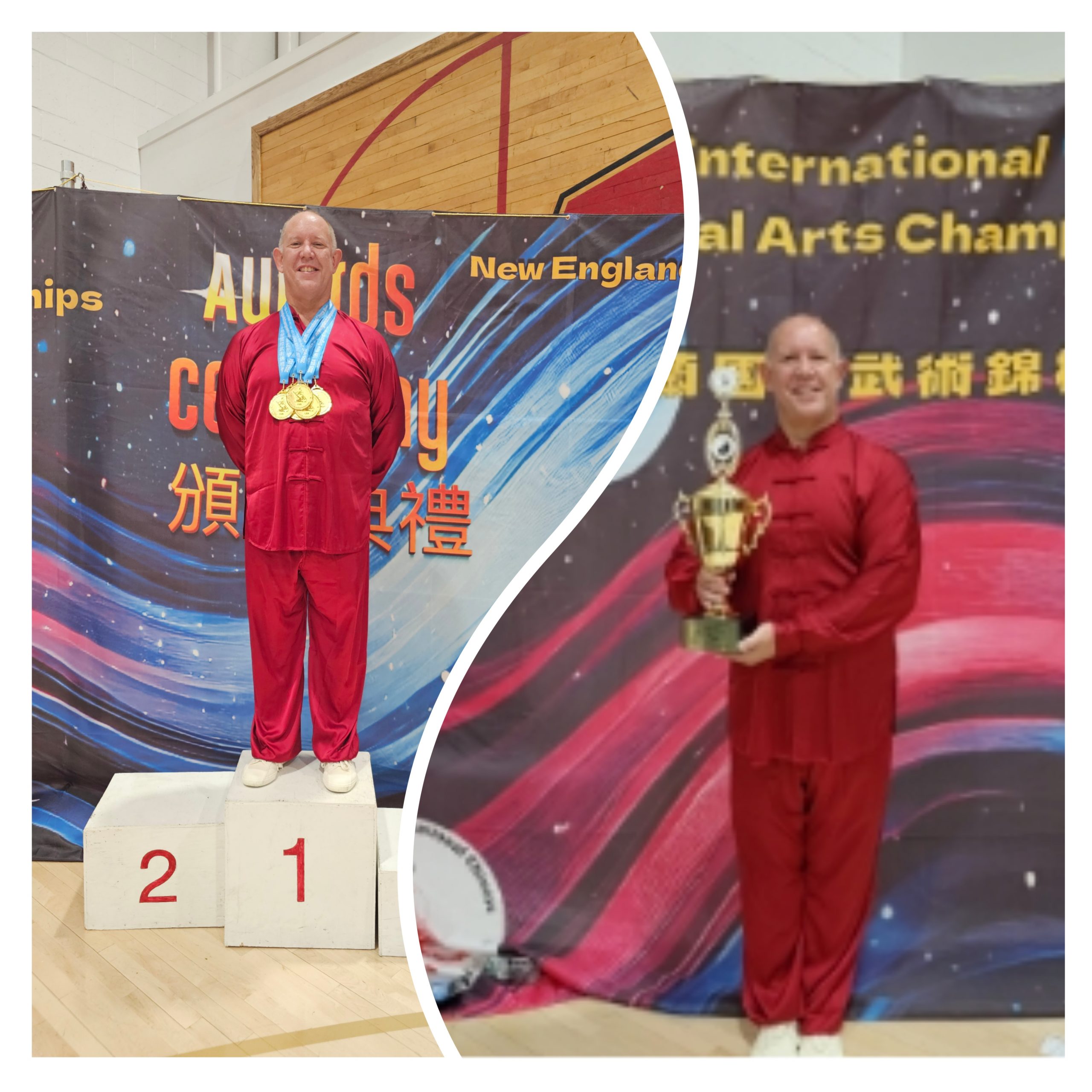 Wisconsin Tai Chi Academy’s Founder and Head Instructor, Sifu Ray Gates, has successfully won six gold medals and the USA National Tai Chi Grand Champion Cup for his gender and age group at the 15th New England International Chinese Martial Arts Championships, held in Manchester, Connecticut, Saturday November 8th.